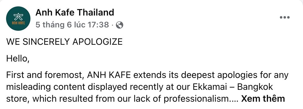 Trước phản ứng dữ dội của dư luận, đại diện ANH KAFE đã nhanh chóng đăng tải lời xin lỗi chính thức bằng tiếng Anh và tiếng Thái trên trang mạng xã hội của mình. Trong bài viết, thương hiệu này thừa nhận đã không lường trước được sự khác biệt văn hóa và khó khăn trong việc chuyển ngữ nội dung gốc.