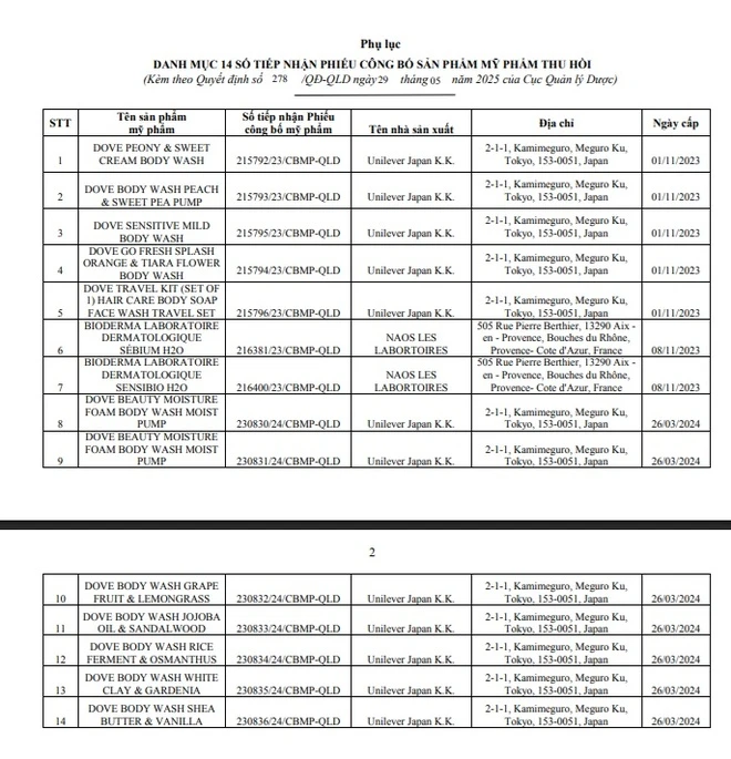 Các phiếu công bố bị thu hồi thuộc nhiều nhóm sản phẩm khác nhau, trong đó có những tên tuổi được người tiêu dùng Việt Nam tin dùng rộng rãi như sữa tắm Dove Peony & Sweet Cream Body Wash, được sản xuất bởi Unilever Japan K.K., hay nước tẩy trang Bioderma Sebium H2O của thương hiệu Bioderma, sản xuất tại Pháp bởi NAOS Les Laboratoires.