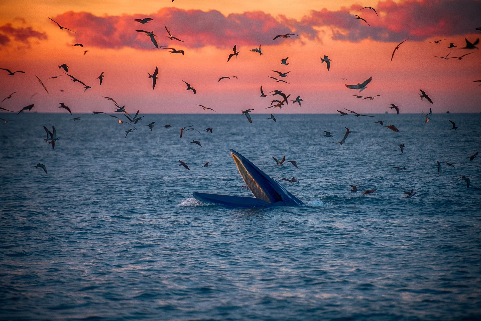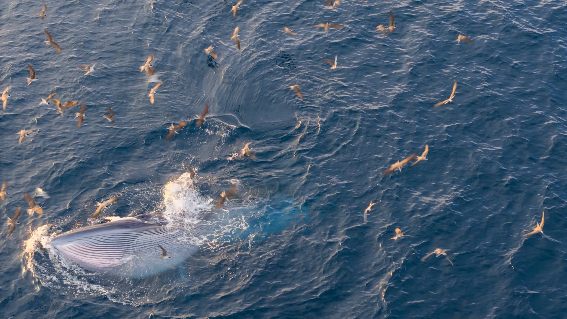 Trong khung cảnh bình minh đỏ rực phản chiếu mặt nước phẳng lặng, hai cá thể cá voi liên tục trồi lên mặt biển, vươn mình khỏi làn nước để săn đàn cá nhỏ. Hoạt động săn mồi kéo dài gần hai tiếng, tạo nên chuỗi chuyển động sống động, không khác gì một bản trình diễn ngoạn mục giữa thiên nhiên.