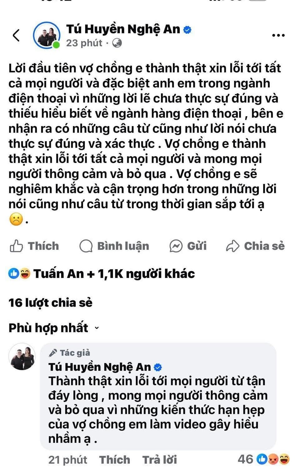 Trước áp lực dư luận, cặp đôi Tú Huyền đã đăng tải lời xin lỗi trên Facebook cá nhân có tích xanh. Trong bài viết, cả hai thừa nhận đã thiếu hiểu biết và sẽ cẩn trọng hơn trong tương lai. Dù vậy, không lâu sau đó, trang Facebook chính thức của cặp đôi bất ngờ bị khóa, chưa rõ nguyên nhân, khiến nhiều người dùng mạng hoang mang.
