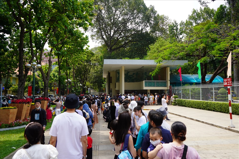 Không đợi đến kỳ nghỉ chính thức, sáng 13/4, khu vực Dinh Độc Lập biểu tượng gắn với mốc son lịch sử của dân tộc đã đông kín người từ sớm. Dòng người xếp hàng trật tự, đa phần là các bạn trẻ, nhóm gia đình và cả du khách nước ngoài mang theo máy ảnh, điện thoại, cờ đỏ sao vàng nhỏ xinh… tất cả tạo nên một không khí đặc biệt ấm áp nhưng tràn đầy tự hào.