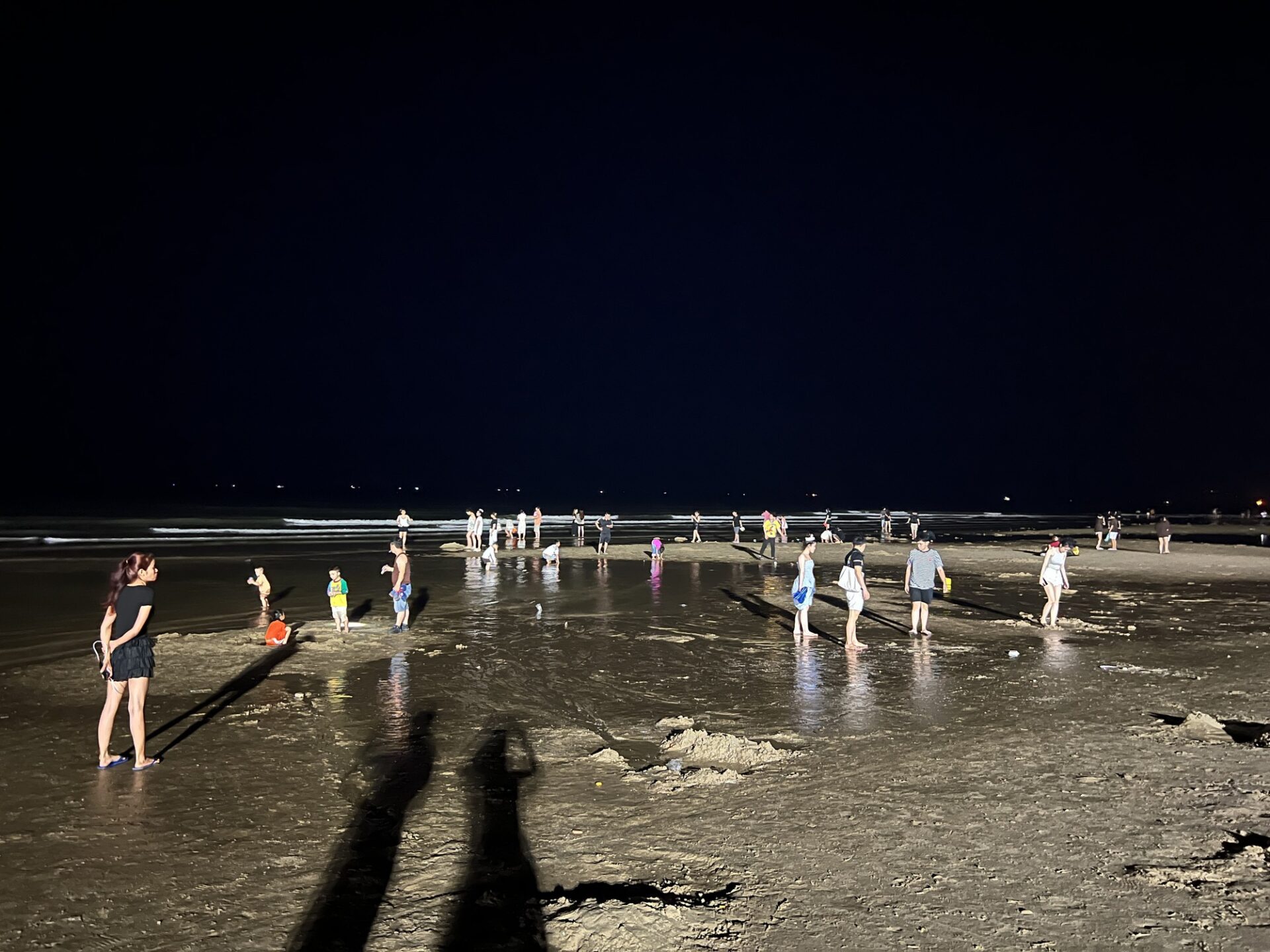 Đáng chú ý, không gian nơi đây chẳng hề tĩnh lặng như nhiều người tưởng tượng. Trái lại, cả bãi biển sáng rực bởi ánh đèn đường, ánh sáng từ các khách sạn, quán xá ven biển, cùng những bóng đèn du khách tự mang theo. Nhờ vậy, không khí nhộn nhịp chẳng thua gì ban ngày: trẻ nhỏ thì cười vang khi nghịch cát, giới trẻ tranh thủ check-in sống ảo, còn người lớn lại thong dong tản bộ, để sóng vỗ vào chân đầy thư thái.