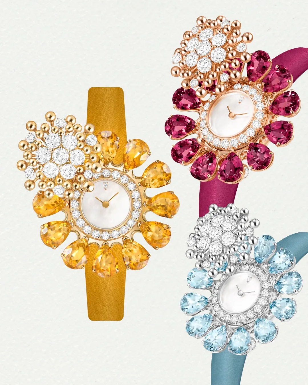 Bên cạnh trang sức, Fleurs d’Hawaï còn giới thiệu ba mẫu đồng hồ bí mật (secret watch) xu hướng đang được các nhà mốt thời trang cao cấp yêu thích thời gian gần đây. Ba mẫu đồng hồ được thiết kế như những tràng hoa ngọc quý, với mặt số xà cừ viền kim cương, được che bởi lớp đá quý hình quả lê.