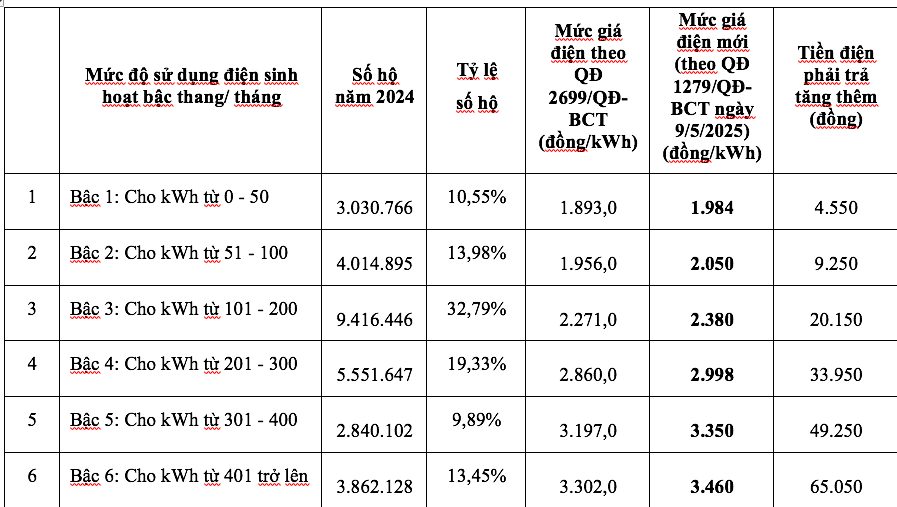 Đối với các hộ sử dụng điện dưới 50 kWh (chiếm 10,55% số hộ sinh hoạt), mức tiền điện tăng khoảng 4.550 đồng/hộ/tháng.