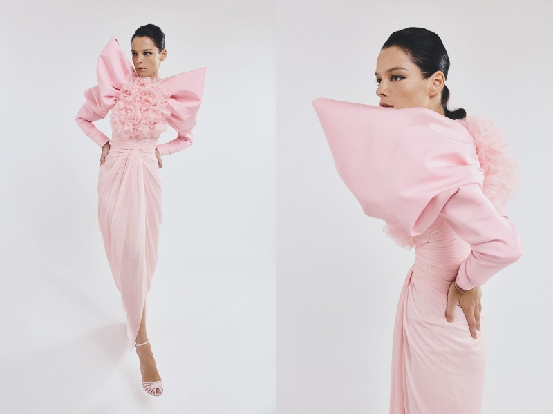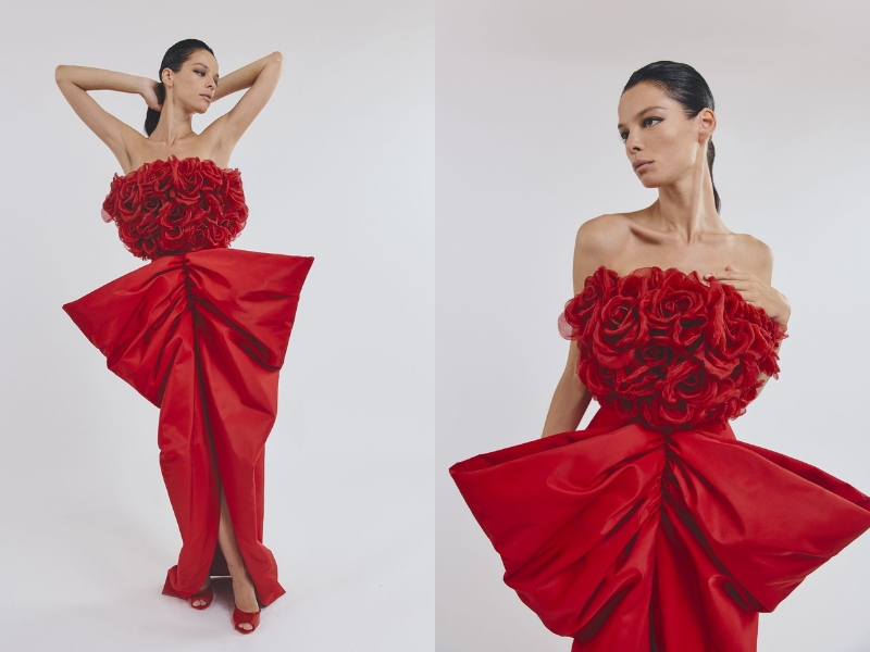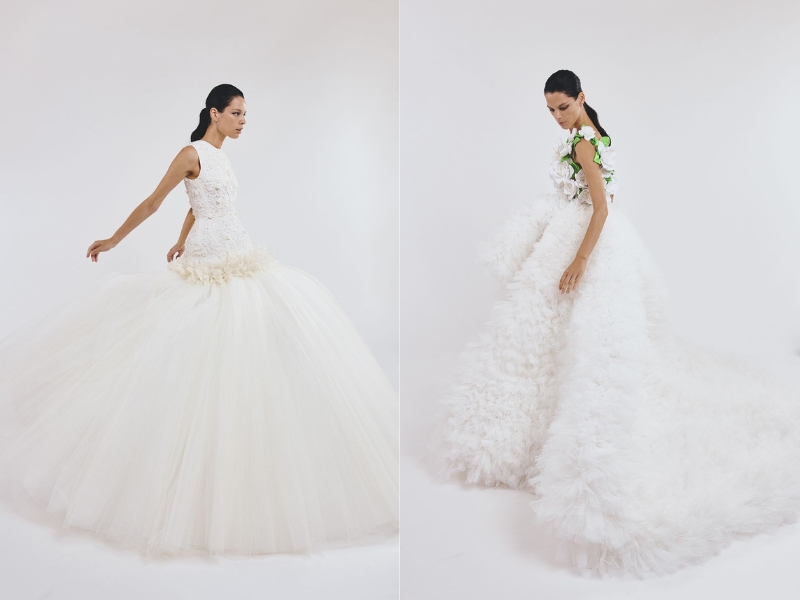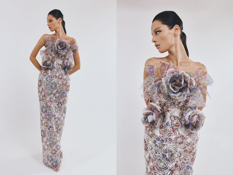 Thay vì sử dụng khung định hình hay cấu trúc khung thép, nhà thiết kế để cho chính vải vóc trở thành phương tiện diễn giải phom dáng. Các chi tiết 3D như nơ lớn, hoa hồng, hay cánh bướm không còn là yếu tố trang trí đơn thuần, mà trở thành phần linh hồn của mỗi thiết kế. Đây cũng chính là điều mà ông gọi là “sức nặng của sự nhẹ nhàng” nơi vẻ mong manh không làm giảm đi chiều sâu mà ngược lại, càng làm nổi bật sức mạnh từ bên trong.