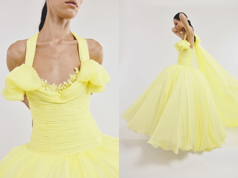 Đáng chú ý, nhiều thiết kế được lấy cảm hứng từ các trang phục của vùng Provence với cổ áo choàng đặc trưng, phối cùng chân váy millefeuille có độ phồng lơ lửng, tạo nên hiệu ứng thị giác như thể các lớp vải đang khiêu vũ giữa không trung. Sự cân bằng giữa cấu trúc sắc nét và chất liệu mong manh là minh chứng cho kỹ thuật couture điêu luyện – vốn là điểm mạnh của xưởng may Giambattista Valli.