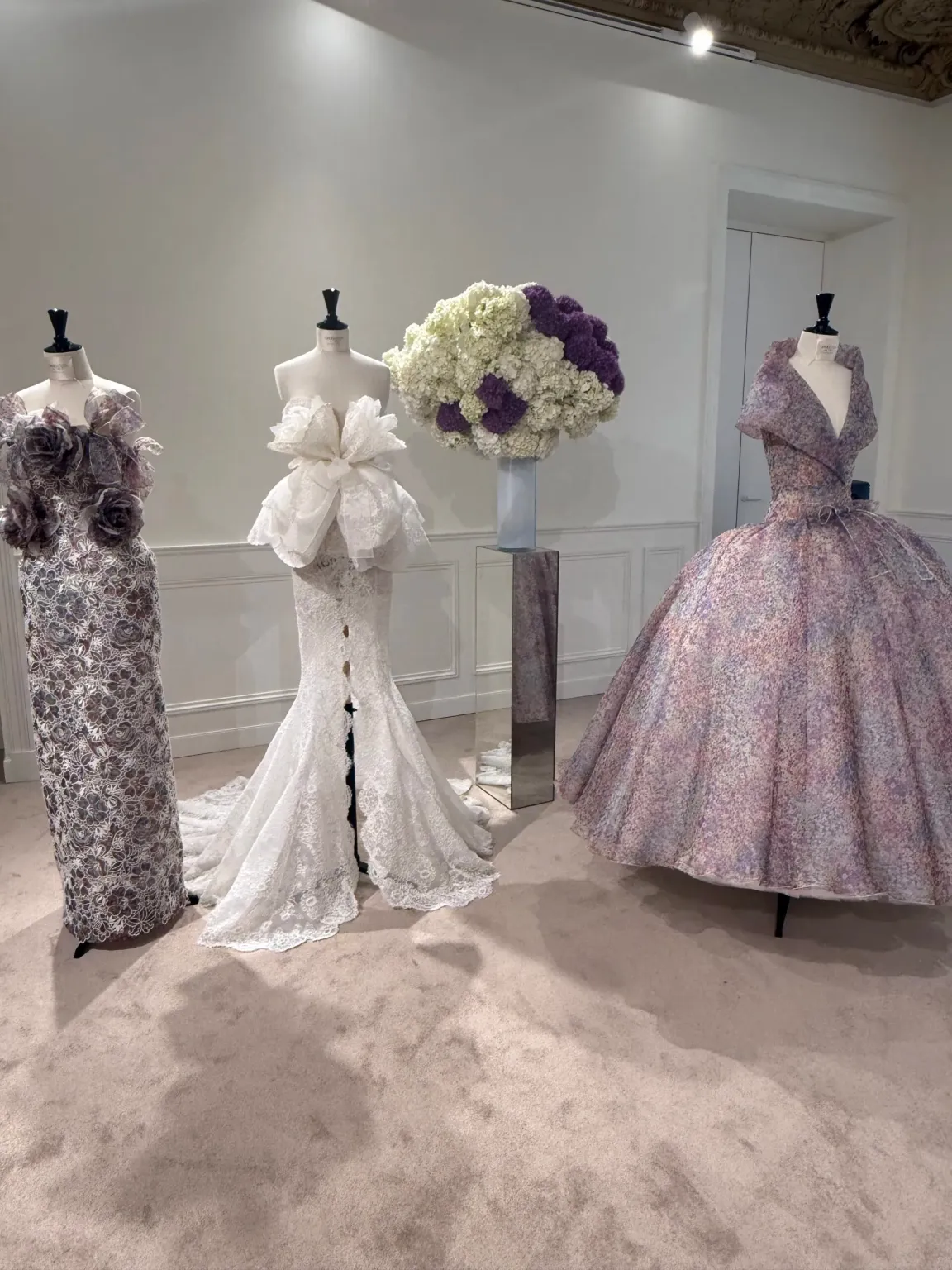 Không theo lối trình diễn runway truyền thống, Giambattista Valli lựa chọn cách trưng bày tĩnh nơi từng bộ trang phục hiện diện như một tác phẩm nghệ thuật độc lập. Ma nơ canh đứng yên, nhường chỗ cho ánh mắt chiêm ngưỡng những chi tiết thủ công tỉ mỉ: từ những nếp gấp vải tinh xảo cho đến cấu trúc 3D được tạo hình như những cánh hoa chớm nở. Tất cả được bao bọc trong không gian đậm đặc mùi hương thực vật, gợi liên tưởng tới một khu vườn cổ tích lửng lơ giữa trời Paris.