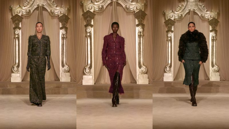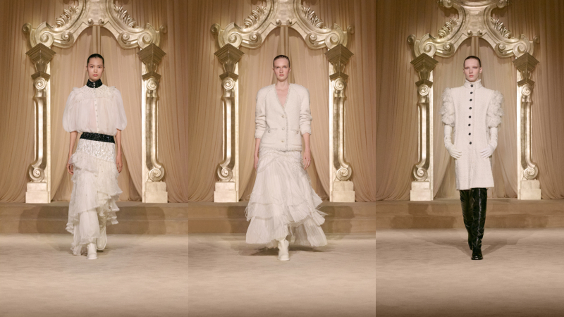 Tweed tiếp tục là chất liệu chủ đạo trong mùa mốt lần này, nhưng không xuất hiện theo cách cổ điển. Áo khoác làm từ bouclé tweed gợi liên tưởng đến lông cừu nguyên sơ; các thiết kế coatdress màu trắng được viền thêu tỉ mỉ như tái hiện lại đường kim mũi chỉ thủ công.