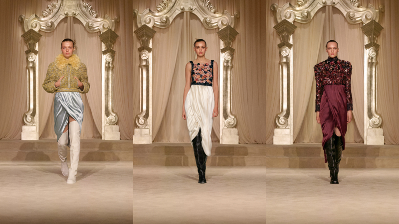 Không chỉ có lúa mì, các chi tiết hoa thêu tay đa sắc cũng xuất hiện trong nhiều thiết kế: áo khoác pea coat, đầm yếm bằng satin crêpe hay các lớp vải chiffon mỏng tang. Những đường kim tỉ mỉ khiến người xem liên tưởng đến nghề thủ công truyền thống châu Âu nơi mỗi sản phẩm không chỉ là quần áo mà là một tác phẩm nghệ thuật.