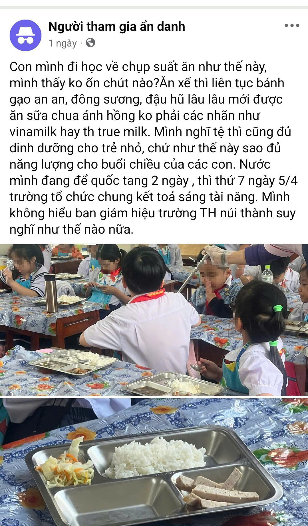 Vài ngày gần đây, mạng xã hội xôn xao với thông tin kèm hình ảnh được cho là bữa ăn bán trú tại Trường tiểu học Núi Thành. Nội dung bài đăng cho hay rằng “bữa ăn bán trú không ổn chút nào” và bày tỏ lo ngại với chất lượng trên thì các cháu không đủ năng lượng cho buổi học chiều.