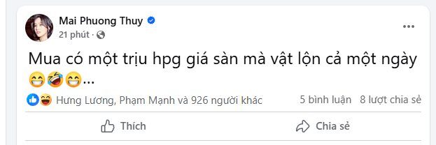 Trên trang Facebook cá nhân ngày 9/4, Hoa hậu Mai Phương Thúy bất ngờ chia sẻ: “Mua có một trịu HPG giá sàn mà vật lộn cả một ngày…”  dòng trạng thái ngắn gọn nhưng đủ sức “khuấy đảo” cộng đồng đầu tư. Trong giới tài chính, dòng chữ tưởng chừng vu vơ ấy lại ẩn chứa khả năng sinh lời khủng khiếp: 1 triệu cổ phiếu HPG, mã của Tập đoàn Hòa Phát.