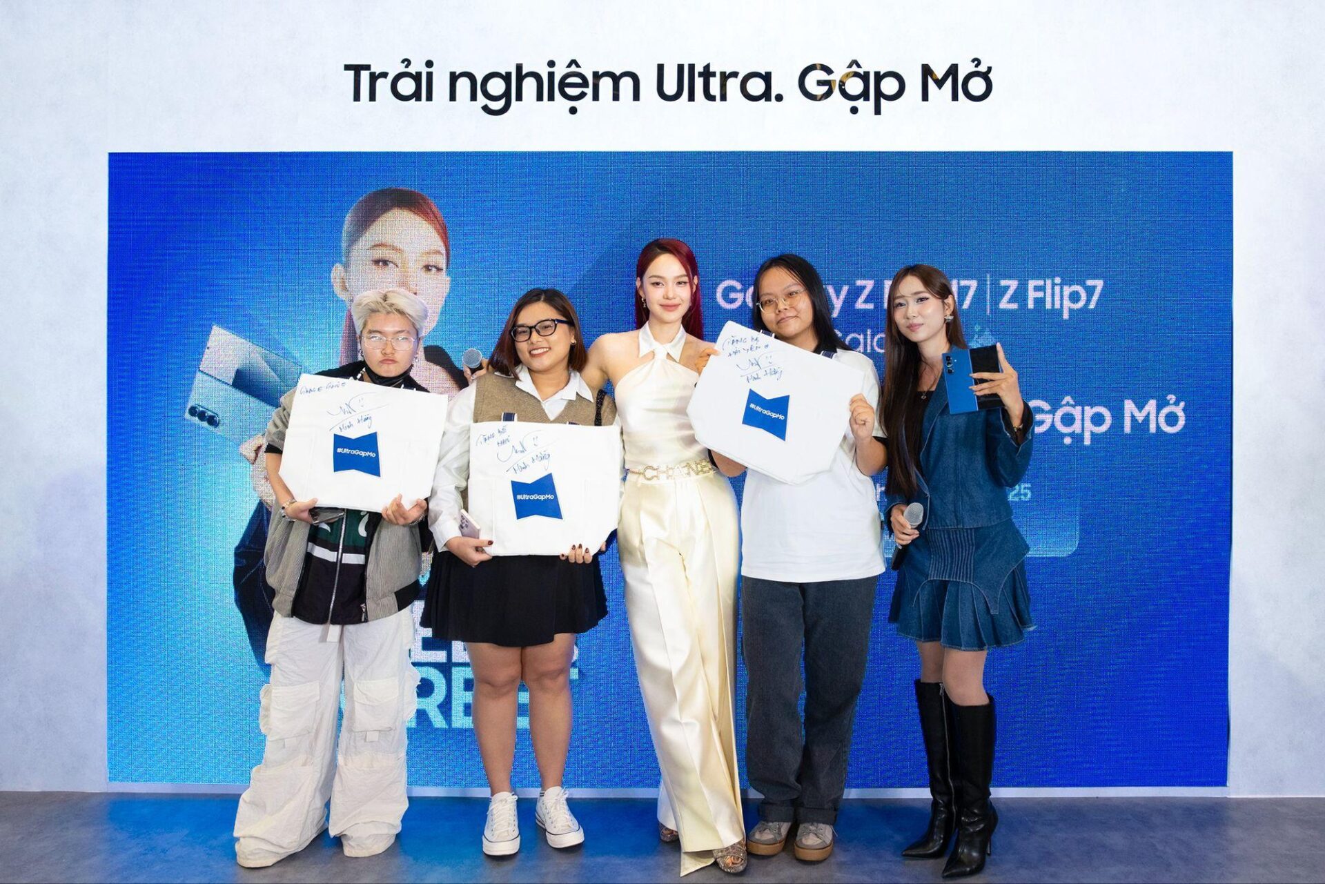 Điểm nhấn của chương trình là màn thị phạm công nghệ trực tiếp do chính Minh Hằng thực hiện. Cô sử dụng Galaxy Z Fold7 để chia đôi màn hình, chỉnh sửa ảnh bằng công cụ AI, rồi tiếp tục chụp ảnh selfie bằng camera 200MP cùng các fan. Tất cả thao tác diễn ra liền mạch, trực quan và dễ hiểu, cho thấy thiết kế sản phẩm đã được tối ưu hoá cho trải nghiệm thực tế.