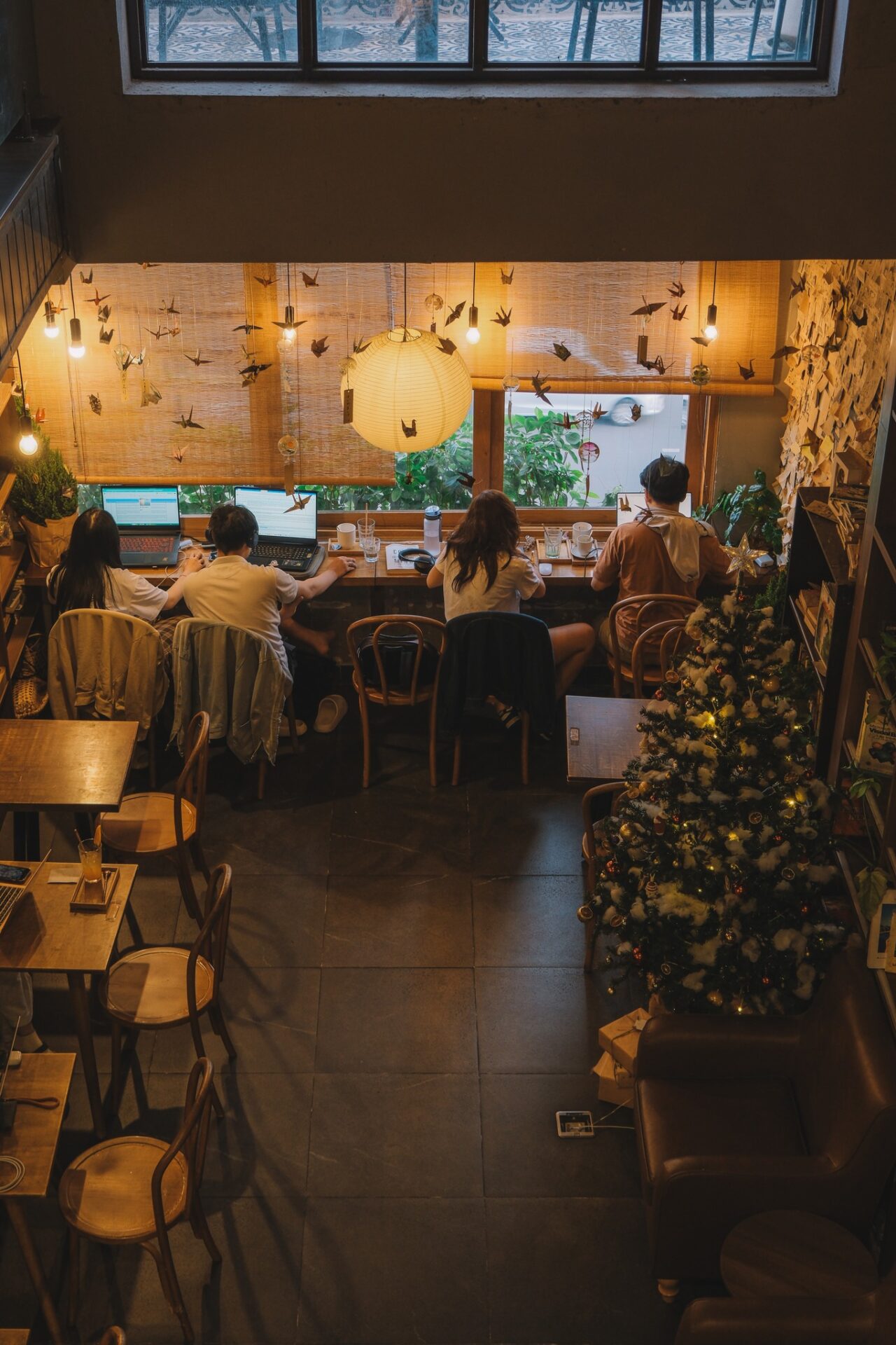 Dù nằm ngay trung tâm, quán vẫn giữ được không khí tĩnh lặng. Nhạc nền nhẹ như hơi thở, nhân viên không vồn vã, khách đến rồi đi nhưng ít ai làm ồn. Có người ngồi đọc sách, người khác lại làm việc, một vài nhóm bạn tụ họp yên ắng và cả những kẻ cô đơn chọn góc khuất, đơn giản để được yên bình.