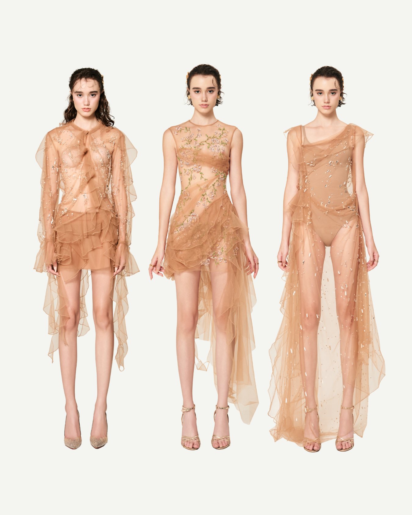 Lấy cảm hứng từ bức họa Venus Verticordia của danh họa Dante Gabriel Rossetti, BST như một bản diễn giải thời trang về hình ảnh người phụ nữ mang vẻ đẹp thiêng liêng, quyến rũ và không khuất phục. Những thiết kế mô phỏng hoa anh túc đính kết thủ công gợi nhắc khu vườn cấm nơi vẻ đẹp và dục tính hòa quyện, nhưng không bị bóp méo bởi định kiến.