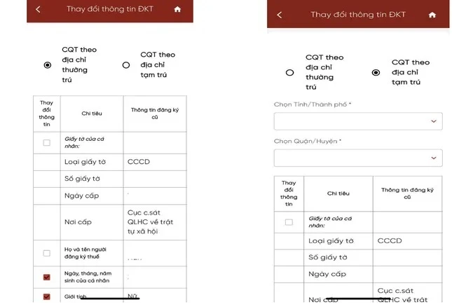 Với ứng dụng eTax Mobile – vào mục “Thay đổi thông tin đăng ký thuế” và làm theo hướng dẫn. Trường hợp nhận được thông báo “Người nộp thuế không có trên Cơ sở dữ liệu quốc gia về dân cư”, cá nhân cần liên hệ cơ quan công an để cập nhật lại thông tin định danh.