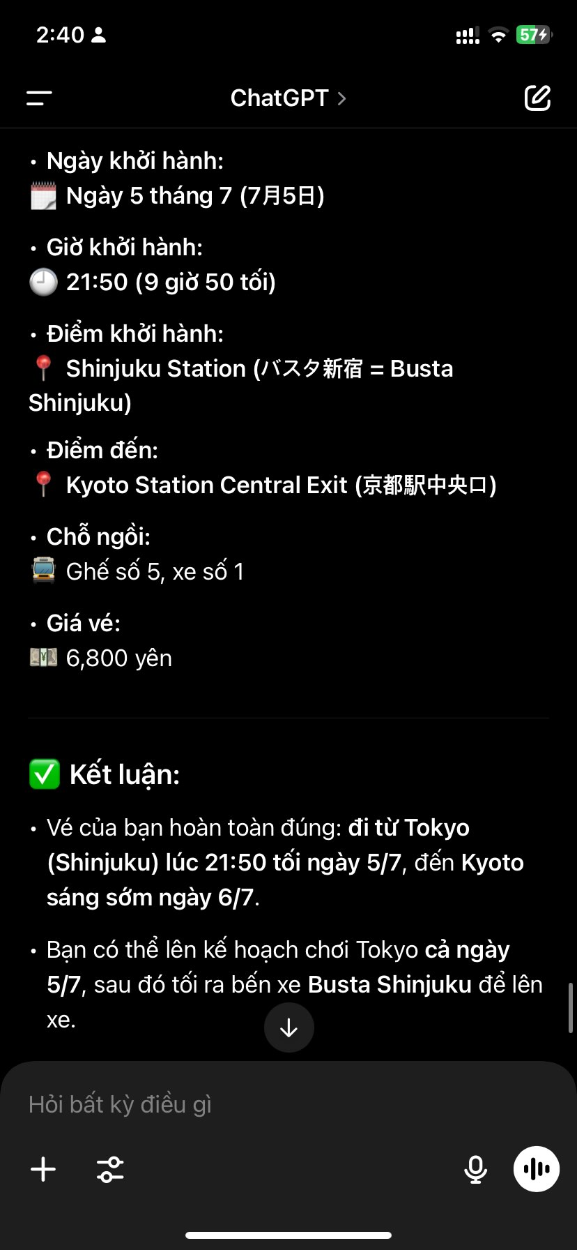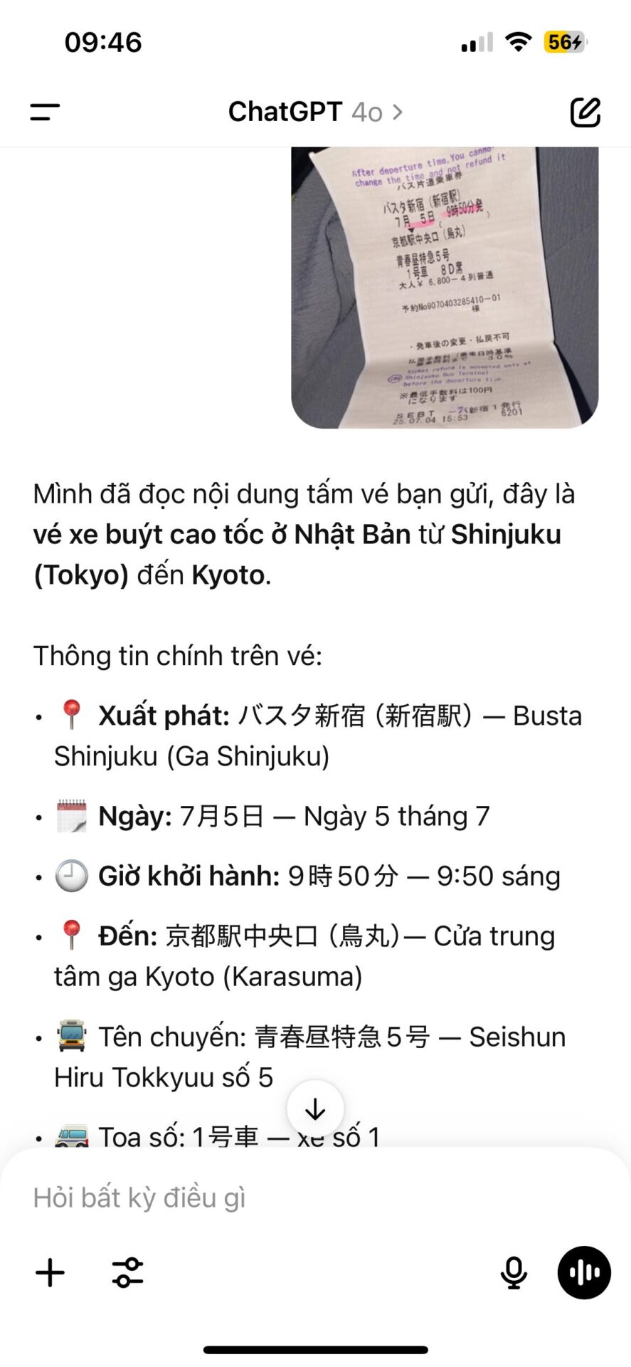 Theo chia sẻ được đăng tải trên mạng xã hội, cô gái Việt Nam đã lên kế hoạch di chuyển từ Tokyo đến Kyoto bằng xe buýt, chọn chuyến khởi hành lúc 9h50 sáng để tiết kiệm chi phí. Tuy nhiên, do không chắc chắn với thông tin in bằng tiếng Nhật trên vé, cô đã sử dụng ChatGPT để dịch lại nội dung.