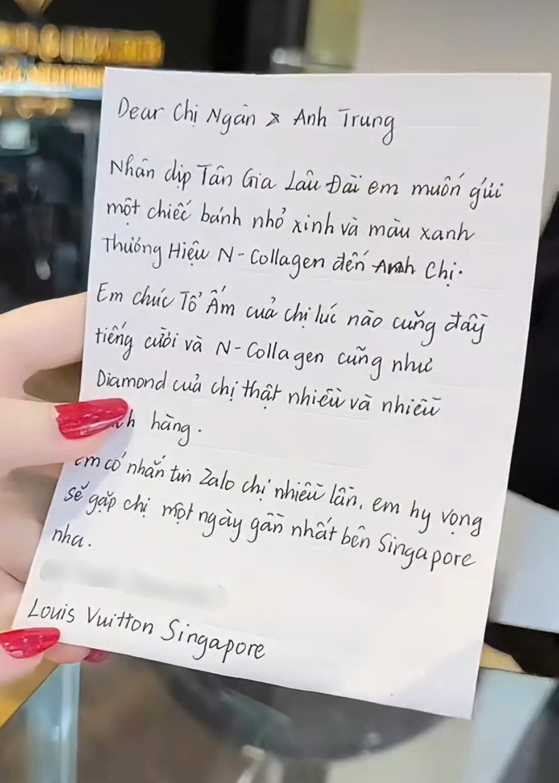 Trong video đăng tải trước đó, Ngân Collagen tiết lộ cô được Louis Vuitton Singapore mời dự sự kiện thông qua một… lá thư viết tay bằng tiếng Việt, kèm bánh kem màu xanh lá mạ. Không những vậy, thương hiệu còn “nhiệt tình” nhắn tin qua Zalo để liên hệ cô – theo lời kể của chính chủ.