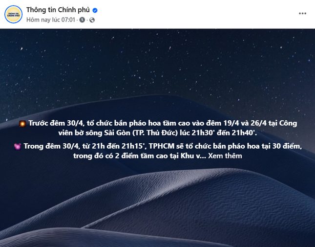 Theo thông tin từ Cổng Thông Tin Chính Phủ, hai đêm 19/04 và 26/04 sẽ có màn bắn pháo hoa tầm cao tại Công viên bờ sông Sài Gòn (TP. Thủ Đức), diễn ra từ 21h30 đến 21h40. Đây được xem là “buổi tổng duyệt ánh sáng” hiếm hoi mà người dân có thể chiêm ngưỡng trước ngày lễ chính.