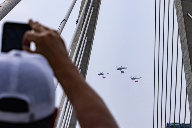Sự xuất hiện của đội hình bay treo cờ mang đến cảm giác thiêng liêng và trang nghiêm. Trong khoảnh khắc ấy, giữa không gian của nhịp sống đô thị sôi động, lá cờ đỏ sao vàng đã trở thành tâm điểm khiến bao ánh mắt dõi theo không rời.