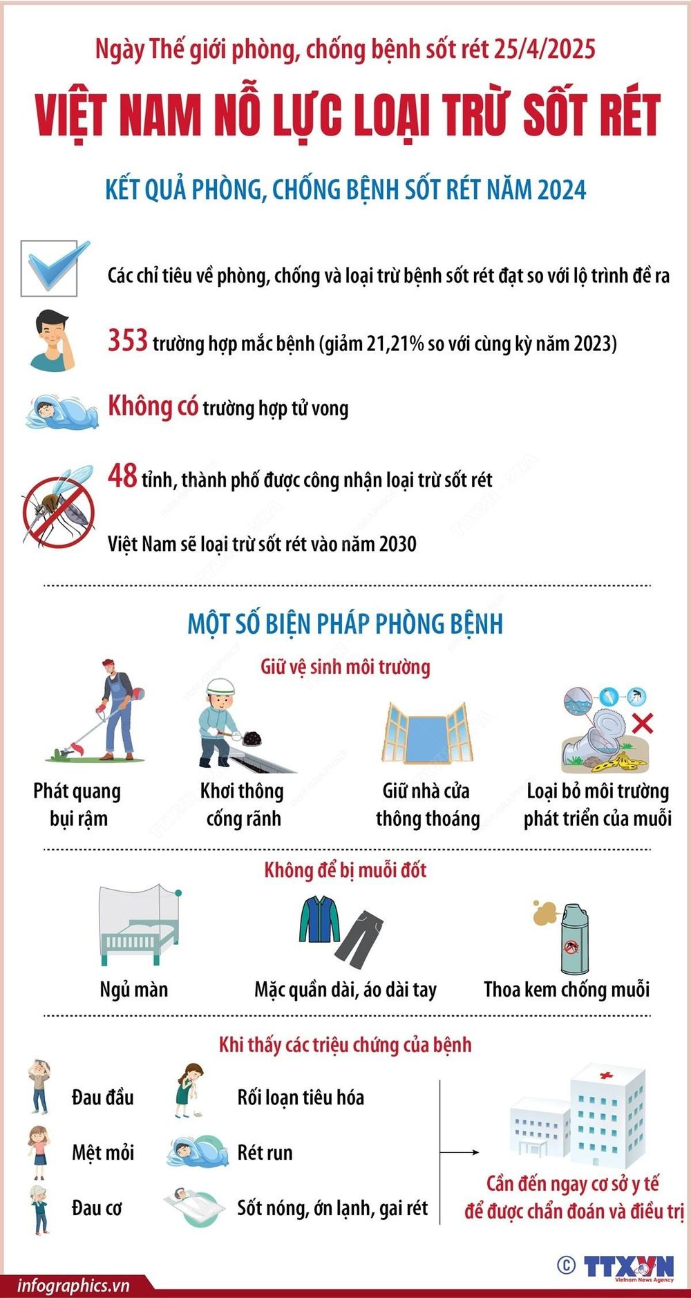 Đến năm 2024, đã có 48 tỉnh, thành phố được công nhận loại trừ sốt rét. Các chỉ tiêu về phòng, chống và loại trừ bệnh sốt rét đạt so với lộ trình đề ra, qua đó, tiếp tục khẳng định Việt Nam sẽ loại trừ bệnh sốt rét vào năm 2030./.